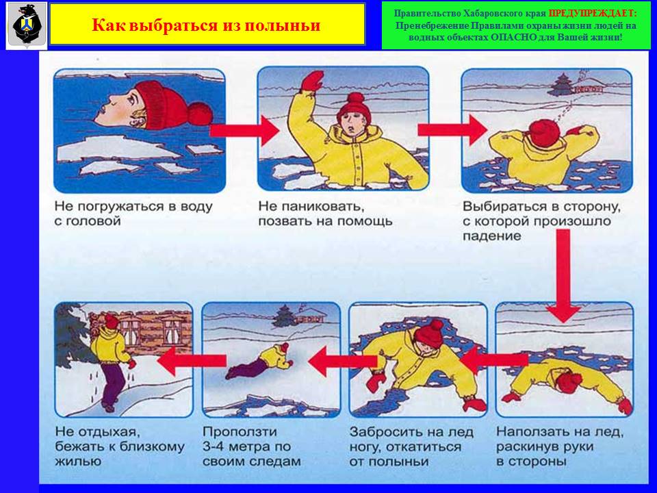 - Следует ползком, широко расставляя при этом руки и ноги и толкая перед собою спасательные средства, осторожно двигаться по направлению к полынье.