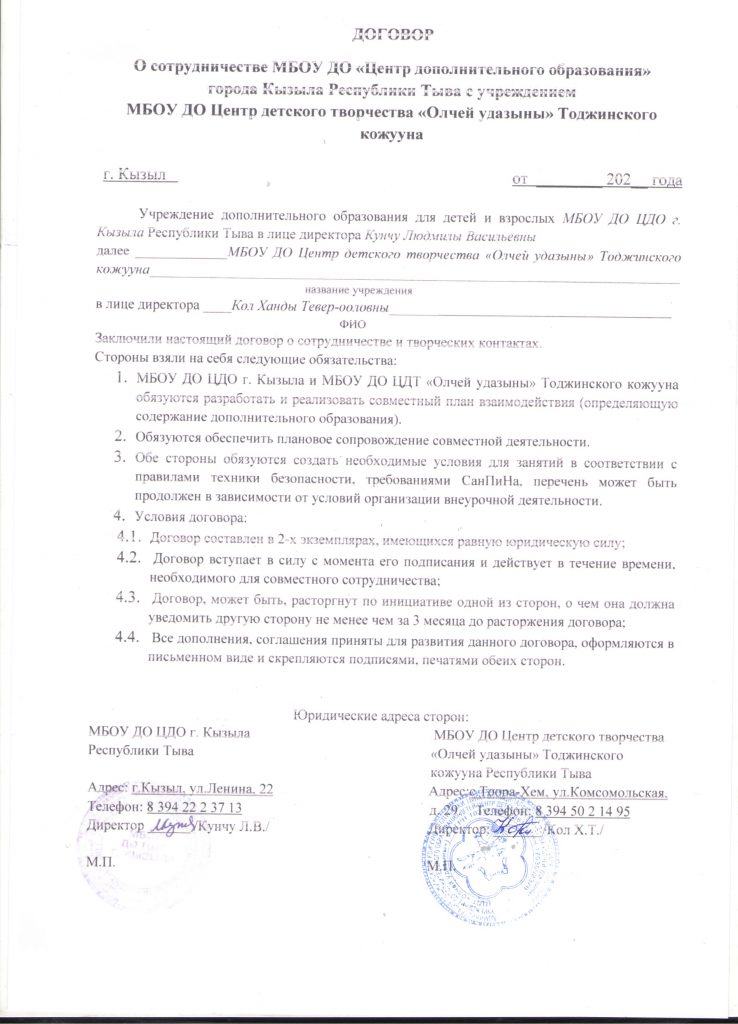 Договор о взаимном сотрудничестве по организации и проведению мероприятий с МБОУ ДО «ЦДО» г.Кызыл и МБОУ ДО ЦДТ «Олчей удазыны»